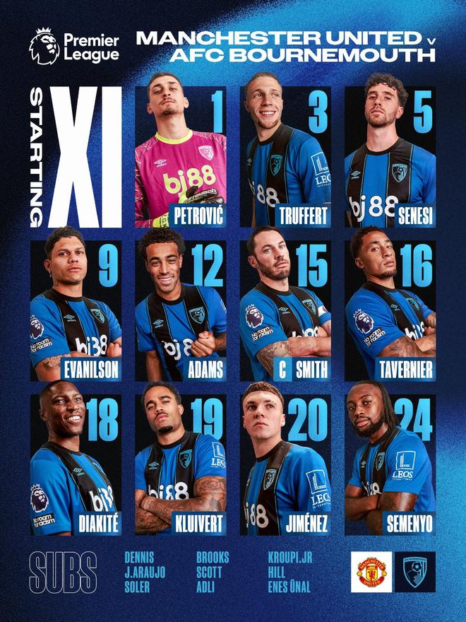 北京时间12月16日英超日报凌晨4点,英超联赛第16轮展开一场焦点战役,曼联对阵伯恩茅斯。赛前,双方公布首发阵容。