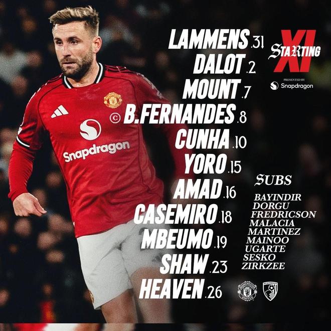 曼联首发:31-拉门斯、2-达洛特、15-约罗、26-海文、23-卢克-肖、18-卡塞米罗、8-B费、7-芒特、16-阿马德-迪亚洛、10-库尼亚、19-姆伯莫