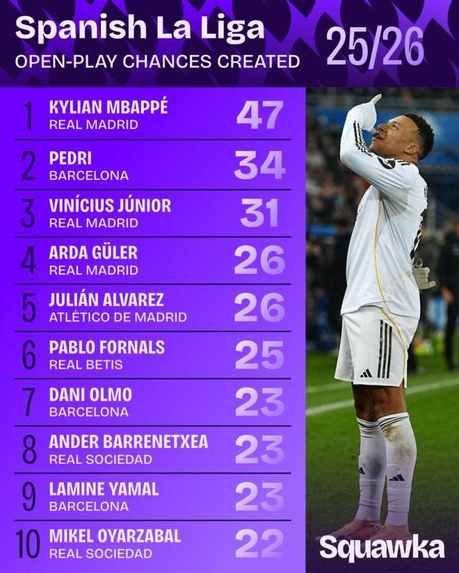 根据统计,本赛季到目前为止,姆巴佩是西甲当中运动战创造机会最多的球员,佩德里位居第二,维尼修斯位居第三。