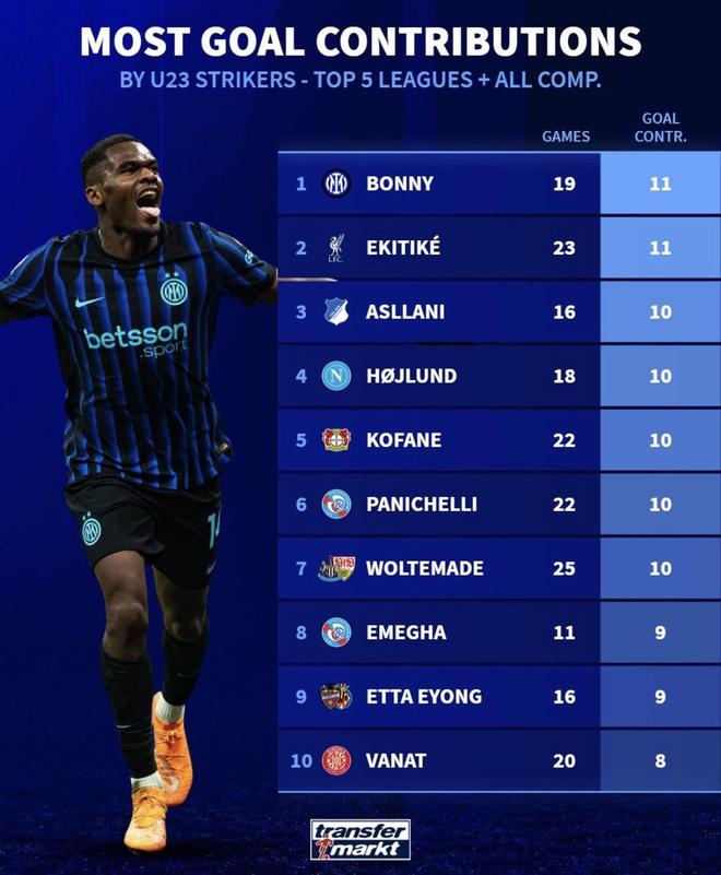 本赛季五大联赛U23前锋直接参与进球前10:博尼、埃基蒂克第1