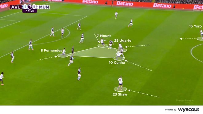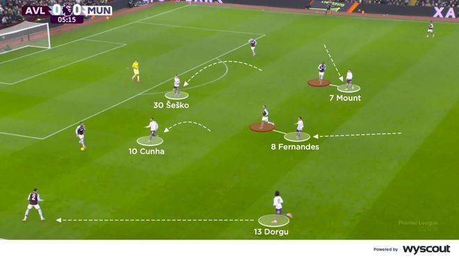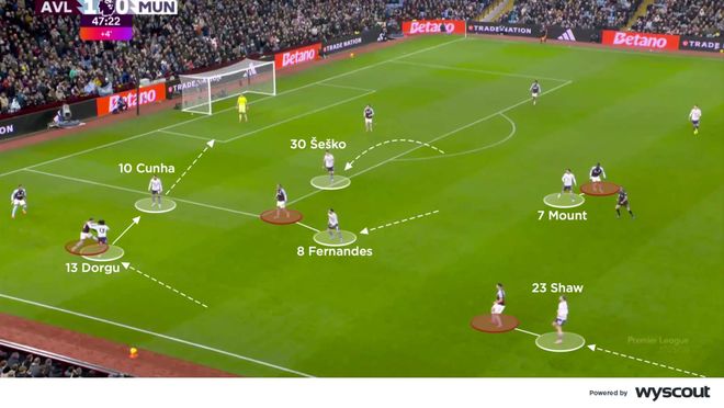 曼联开场的高位逼抢很有效,尤其是在他们把对手的进攻方向引导至本方左路时:作为中锋的舍什科向右移动,封堵传向本方右路的传球线路。随后,库尼亚从中场压上,一旦有人传球给孔萨就启动压迫。此时,芒特会从宽度位置回收,与布鲁诺·费尔南德斯一同盯防维拉的双后腰枢纽。两名边翼卫随后会直接压迫维拉的边后卫(下图),而两名边中卫卢克·肖与约罗则准备为麦金与罗杰斯的插上补防。