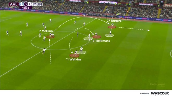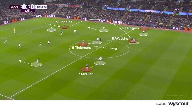在舍什科尝试把比赛引导到右侧未果时,维拉会更多选择长传,主要是从左路发起,以摆脱曼联的高位逼抢。在曼联采用人盯人的防守原则后,罗杰斯与麦金尽量拉开宽度以牵扯曼联的三中卫。曼联的两名翼卫压得较高,也拉开了后防线之间的距离,这就为奥利·沃特金斯提供了可能的进攻线路,让他能在长传后插上抢第一点。蒂勒曼斯作为中路插上者紧随其后,两侧由麦金与罗杰斯支援(下图)。