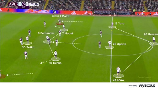 阿莫林针对维拉4-4-2阵型的中场堵截调整了进攻站位,使用曼努埃尔·乌加特作为单一后撤的出球枢纽立在三中卫前。布鲁诺会上前到更高的位置,而芒特与库尼亚的站位则较较阿莫林通常的3-4-2-1中两名10号更加拉开一些。每当维拉的边中场回防时,他们会组成拥挤的后线(下图),限制曼联边翼卫的传中。曼联因此倾向把球通过10号位走肋部,而此时舍什科作为单点中锋做出了几次巧妙的前插,迫使对方门将做出了几次精彩扑救。