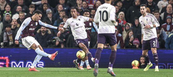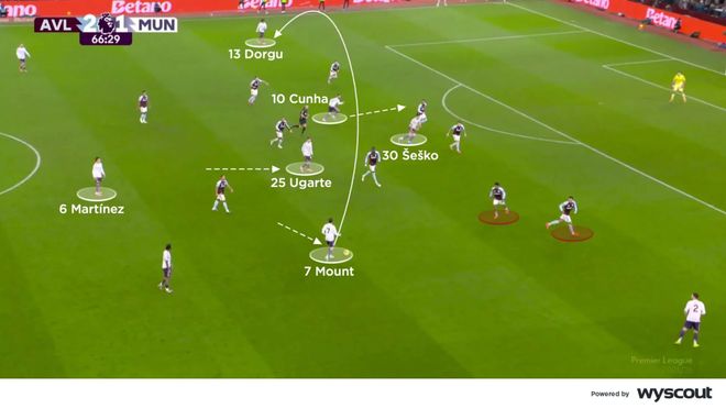 阿莫林在半场将受伤离场的布鲁诺换下,派利桑德罗·马丁内斯入替作为单后腰,而乌加特则在下半场压到更高的位置。曼联继续通过中路推进——芒特在右侧肋部找到一些不错的空档(下图),而维拉的罗杰斯与马特森则有时在防守组织上略显混乱。曼联在宽度上的改进,通过换位或快速配合,找到了翼卫提供传中机会的路径。第66分钟,由多尔古完成了一记很好的传中,但库尼亚错失了再次扳平比分的机会。