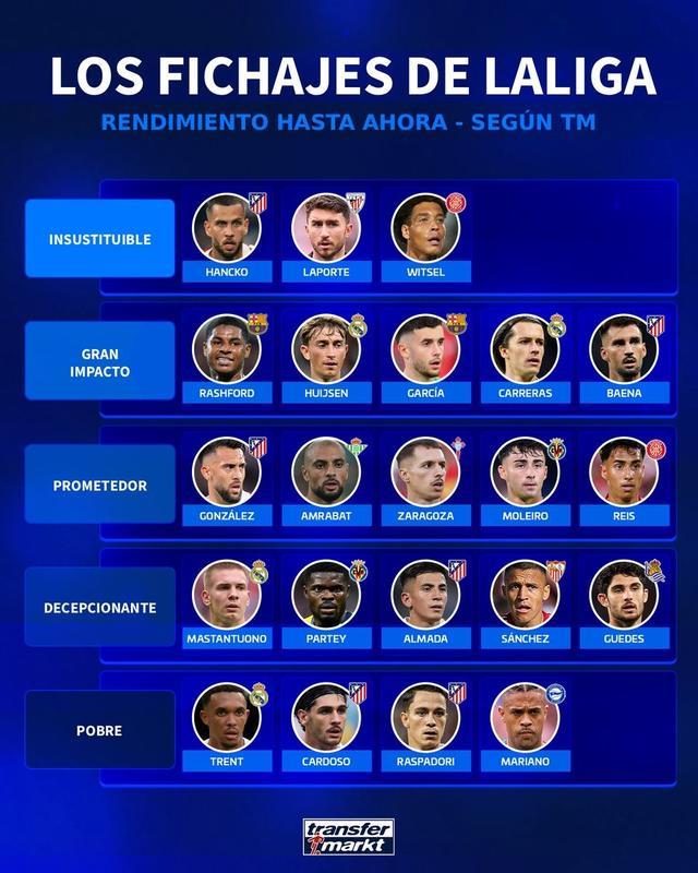 北京时间12月24日西甲日报,德转对西甲今夏的几笔重要转会进行了评级,其中汉茨科、拉波尔特以及维特塞尔被评为无可替代,拉什福德、赫伊森等人被评为顶级,马斯坦托诺被评为令人失望,而亚历山大-阿诺德则被评为表现令人失望。