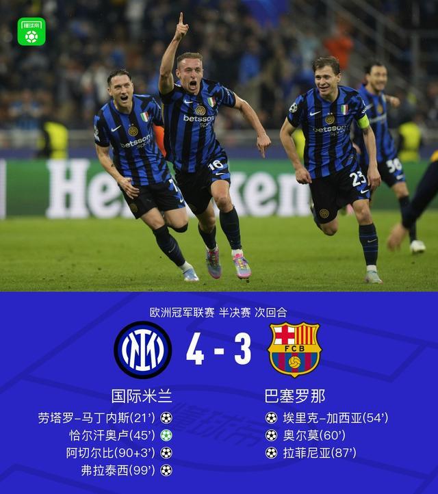 1、24/25赛季欧冠半决赛次回合:国米4-3巴萨晋级欧冠决赛 热度值:3868750