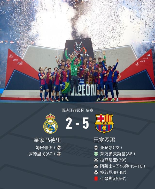 这是本赛季双方的第二次交手,联赛中首回合巴萨4-0大胜皇马,本场比赛皇马也志在复仇。姆巴佩的进球让皇马看到了复仇的可能,但随后巴萨就接管了比赛,他们连续打进5球,而皇马只在巴萨十人应战后由罗德里戈打进第二球,就这样,巴萨单赛季第二次战胜皇马,并且夺得了西超杯冠军。