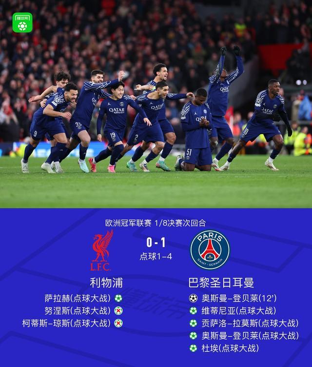 上赛季的利物浦在新帅斯洛特的执教下在联赛中高歌猛进,欧冠同样也战绩出色,联赛阶段他们7胜1负高居榜首,巴黎则是落位附加赛,在战胜布雷斯特后才晋级淘汰赛,相信大部分球迷都觉得利物浦会轻松过关,不过真正的交手结果让人出乎意料——首回合巴黎狂攻无果,但次回合他们扳平总比分,随后点球大战赢下利物浦,成功晋级,也由此开启了自己一个赛季的神奇之旅。
