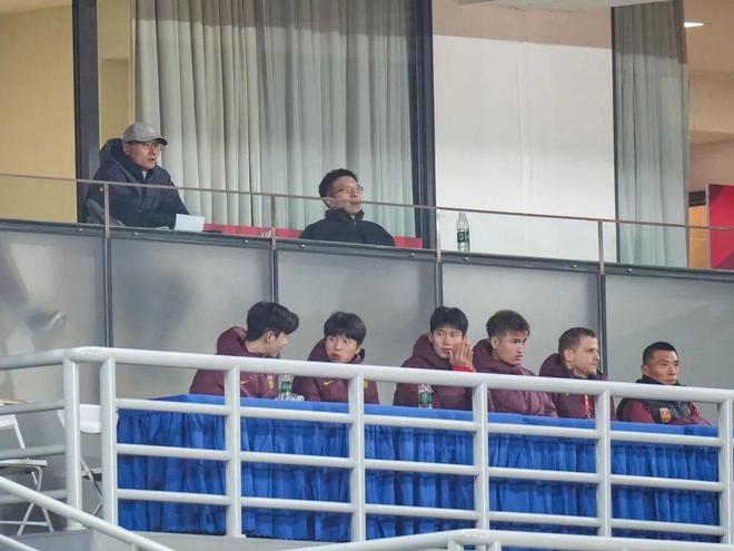 2025年11月18日,中国男足国家队主教练邵佳一(上排左)在2025CFA中国之队·熊猫杯国际足球锦标赛中观赛。记者 王曦 摄