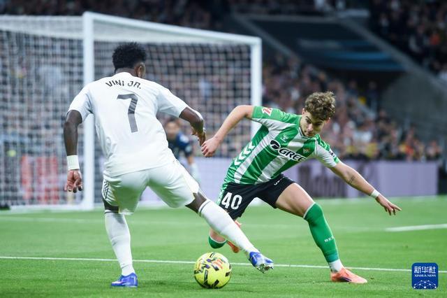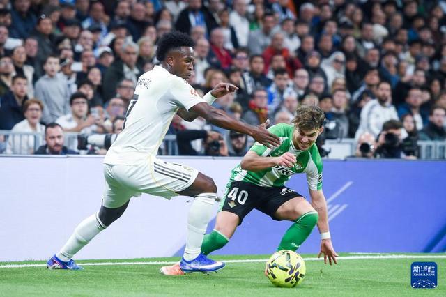 1月4日,皇家马德里队球员维尼修斯(左)和皇家贝蒂斯队球员安赫尔·奥尔帝斯拼抢。发(古斯塔沃·巴连特摄)