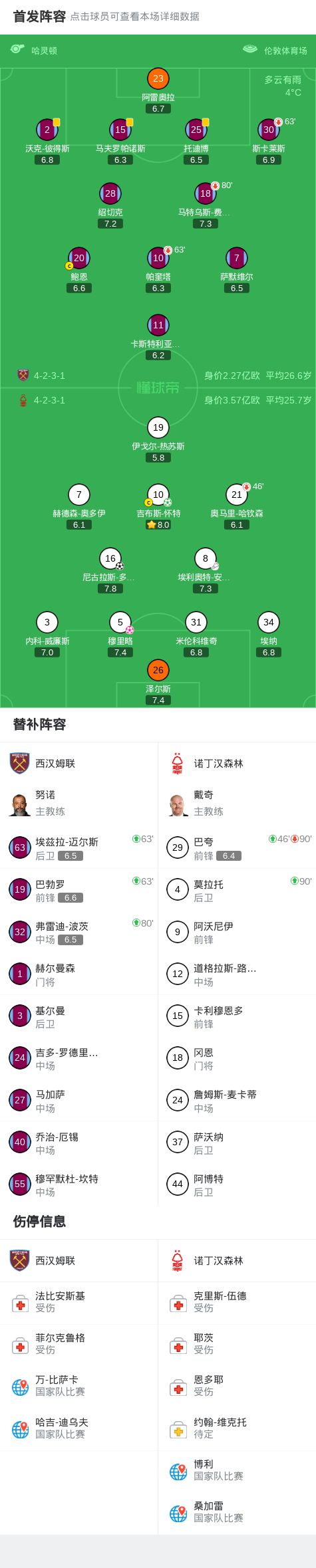 诺丁汉森林2-1逆转西汉姆联,多明格斯破门,吉布斯-怀特点射,穆里略乌龙