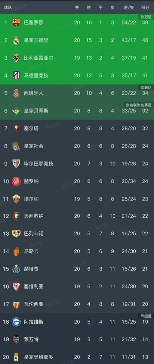 西甲第20轮结束了9场比赛,最新积分榜如下!