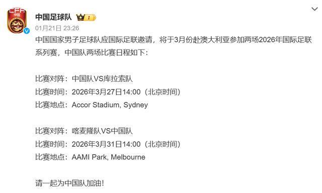 中国队将赴澳大利亚进行比赛,同组对手包括了两支世界杯正赛球队澳大利亚队和库拉索队,还有无缘今年世界杯的喀麦隆队。
