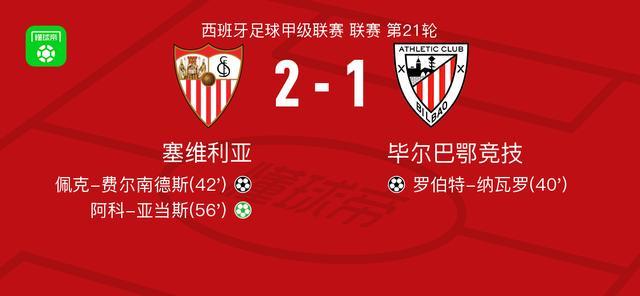 北京时间1月25日西甲日报,西班牙足球甲级联赛第21轮,塞维利亚主场对阵毕尔巴鄂竞技。罗伯特-纳瓦罗率先破门,随后佩克-费尔南德斯破门扳平比分,阿科-亚当斯主罚点球命中完成反超。最终塞维利亚以2比1战胜毕尔巴鄂竞技。