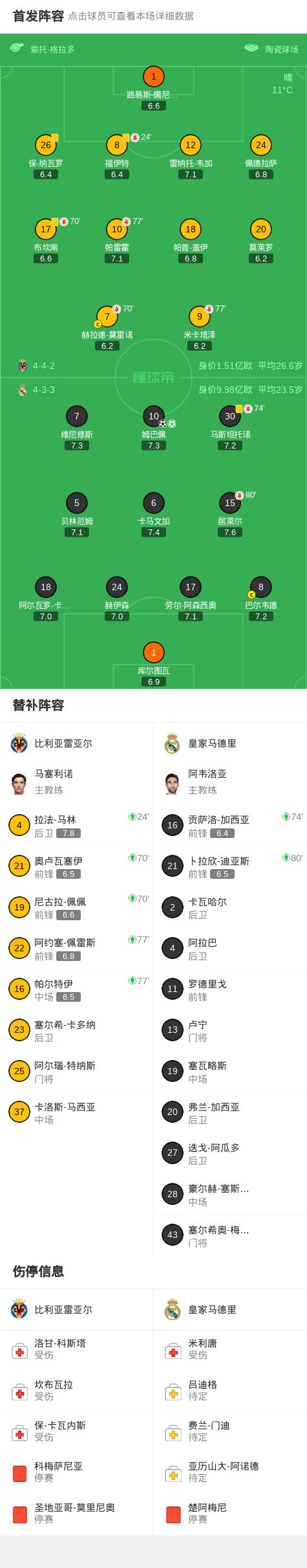 北京时间1月25日西甲日报,西班牙足球甲级联赛第21轮,比利亚雷亚尔主场对阵皇家马德里。上半场居莱尔、维尼修斯打门造险,下半场姆巴佩捡漏破门,莫雷诺失必进球,姆巴佩造点并亲自主罚命中。最终,比利亚雷亚尔0-2不敌皇家马德里。