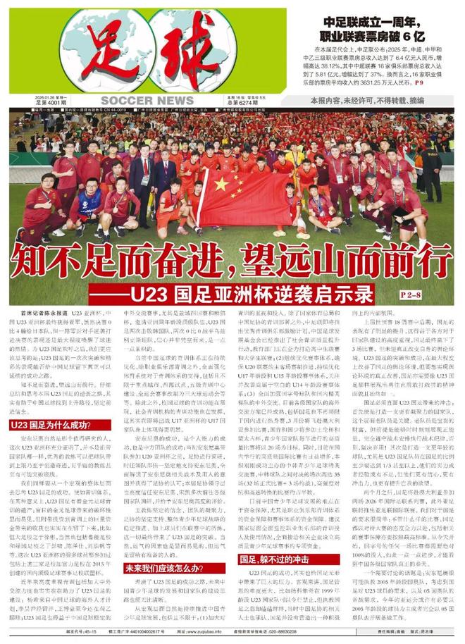 首席记者陈永报道U23亚洲杯,中国U23亚洲杯最终获得亚军,虽然决赛0比4输给日本队,但以第四档球队身份一路零封对手逆袭打进决赛的表现还是最大程度唤醒了球迷的热情。为U23国足欢呼之后,我们更应该思考的是:U23国足的一次次突破和精彩的表现能否给中国足球留下真正可以延续的成功之路。